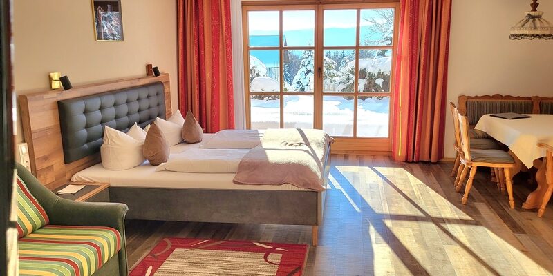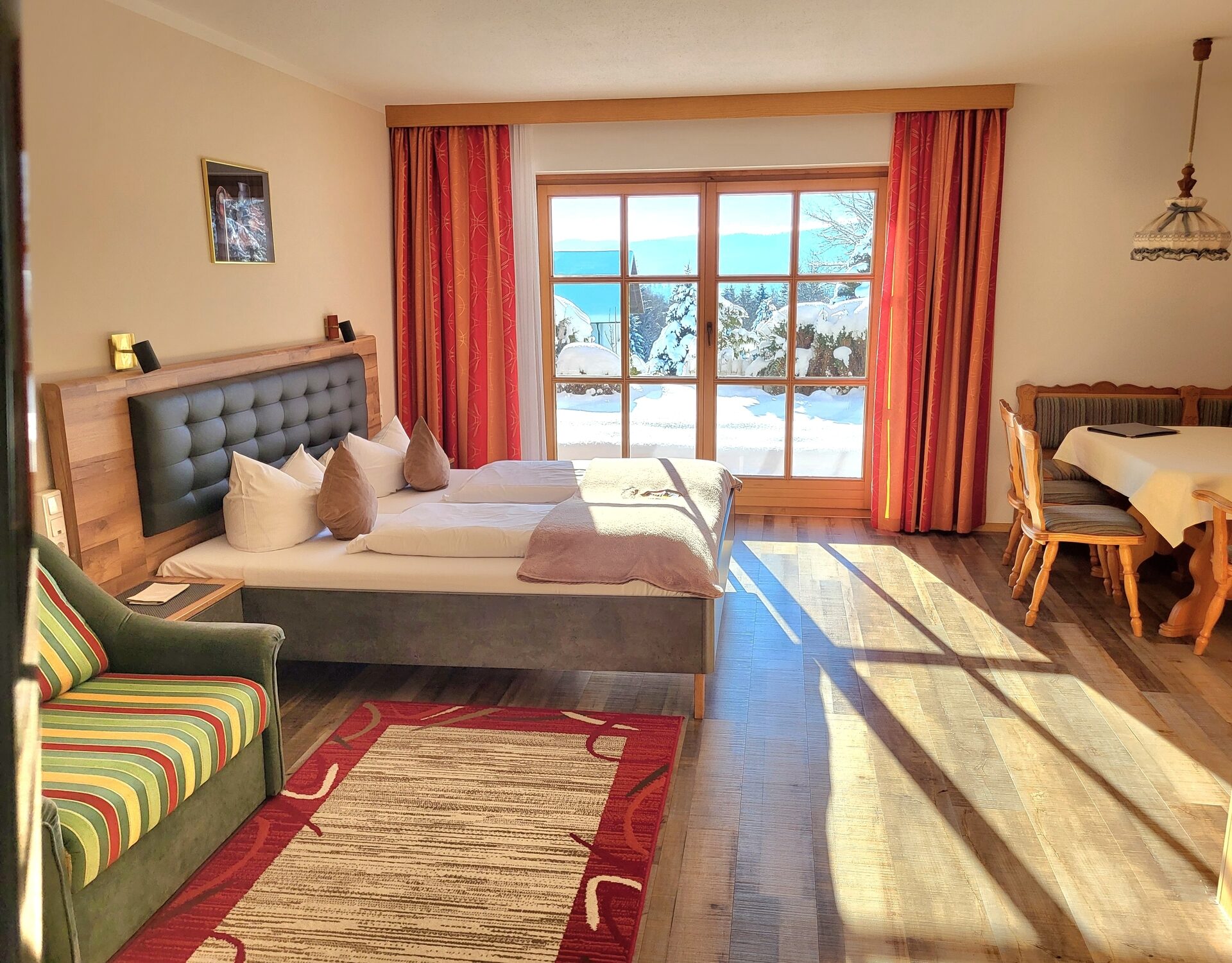 Genießen Sie Ihren Aufenthalt in vollen Zügen in unseren Panoramazimmern mit einem herrlichen Blick in den Garten und auf die Berge des Bayerischen Waldes.